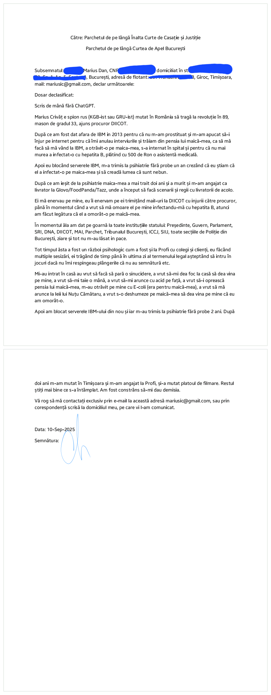 Procurorul Marius Crivăț de la DIICOT. Are un dosar la care nici o instituție a statului nu răspunde. Mă hărțuiește de 10 ani cu STS prin GPS, se uitau pe camerele de supraveghere din toate mall-urile din București pe când făceam livrări la Glovo, Tazz, FoodPanda și m-a trimis la psihiatrie de două ori fără probe. O dată un an, o dată doi ani.