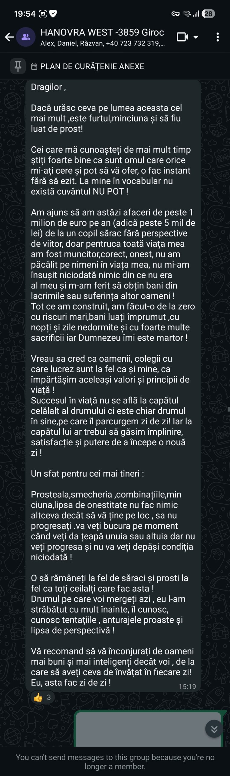 Te dai om de valore, că ai muncit din greu și te piși pe munca mea care lucram 7 din 7 pe tura de noapte când nimeni nu vroia pe schimbul trei? Mă constrângi să-mi dau demisia altfel mă bați? Futuți morții mă-tii de bădăran! Ai ieșit tu din sat dar n-a ieșit satul din tine…