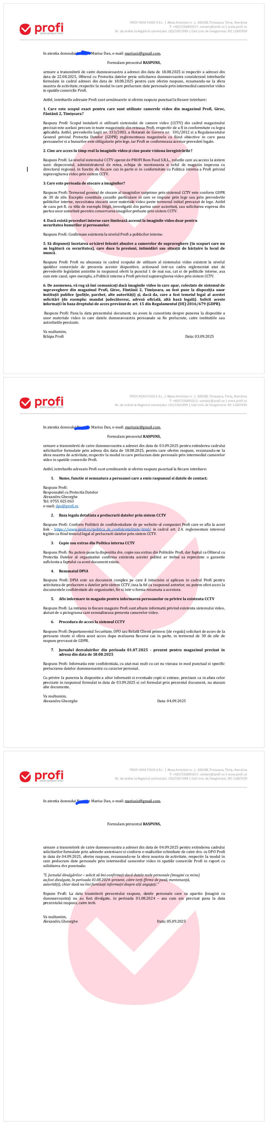 Nu se uită nimeni cu mandat pe camere în Profi? Atunci de ce nu se semnează și nu se ștampilează DPO-ul companiei pe răspunsuri?